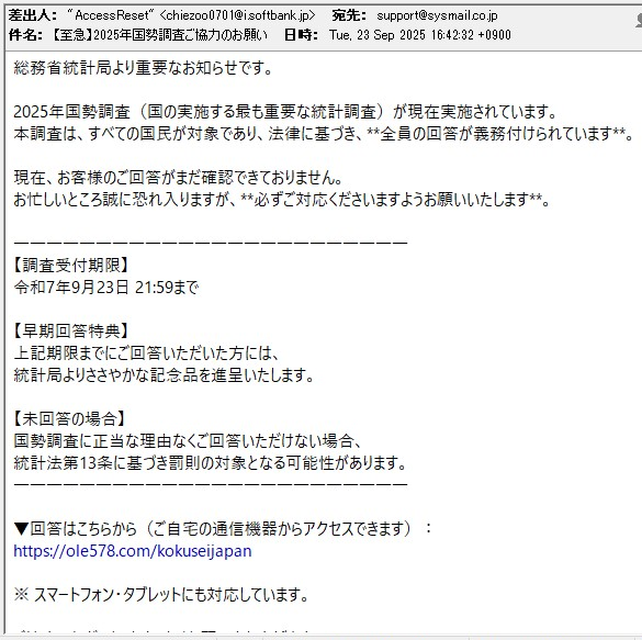 国勢調査の期間に乗じて、国勢調査の偽メールまで出回るようになりました。