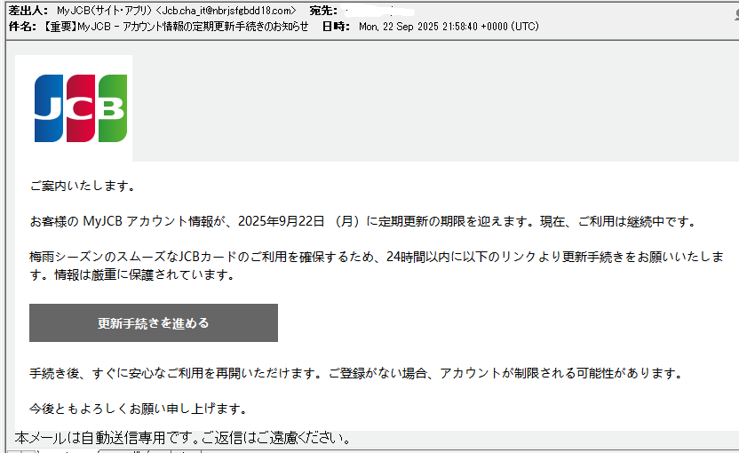 JCBの偽メール:アカウント情報の定期更新手続き:本文の内容からおかしい