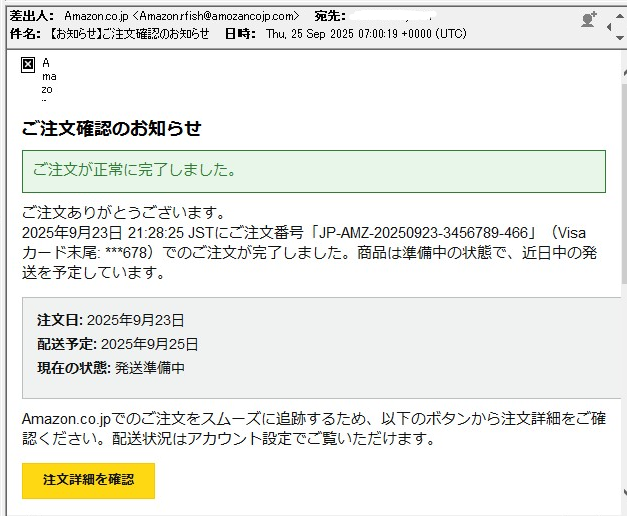 何も注文した覚えがないのに、突然こんなメールが来たら、思わず「何買ったっけ?」や、「アカウント乗っ取られて知らぬ間に何か買われた?」と思って、「注文詳細を確認」をクリックして、内容を確認したくなりそうです。おそらく、それがこのメールの目的だと思われます。