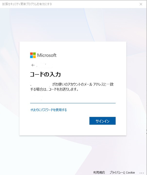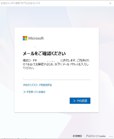 Microsoftアカウントに登録しているメールアドレスに確認コードが送られてくるので、自分のメールで間違いないか確認をして、「コード送信」をクリックします。