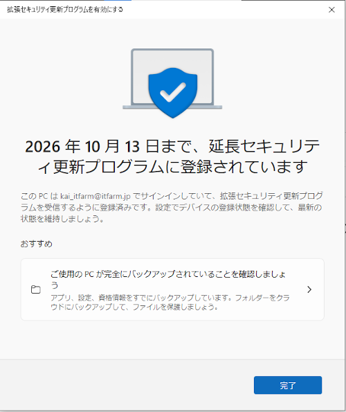 すべての手続きが終了すると、以下のような画面が表示されます。これで登録は完了です。あと1年間はWindows10を利用できます。