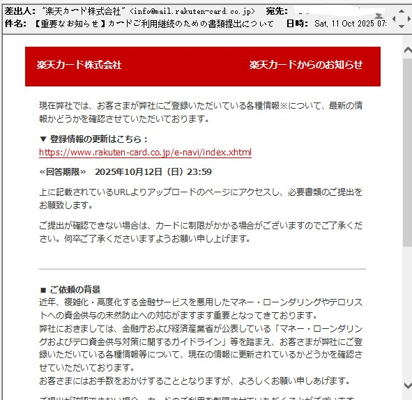差出人のメールアドレスも本物の楽天のメールアドレスになっているので、ここだけで本物か偽物かを判断してはいけません。