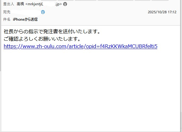 仕事関係を装ったメール:社長からの指示で発注書を送付いたします